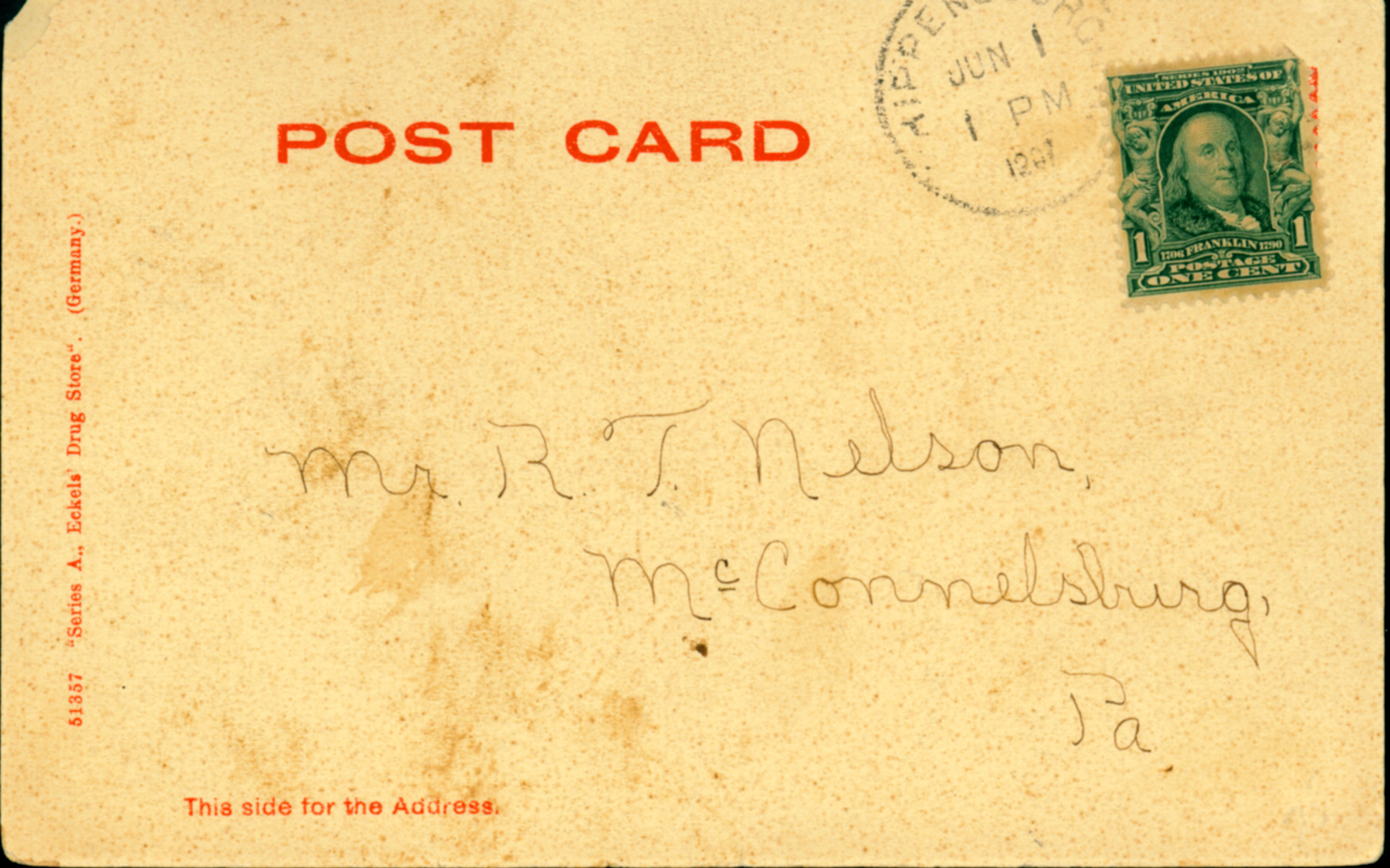 Postcard with caption "Ladies' Dormitory, State Normal School, Shippensburg, Pa". Handwritten note on front reads: "Thank you for the card. I room with M. Hockenberry. Poor Mr. Kirk left with the measles. We are very busy taking Junior and Middle. Myrtle will write soon. Looking for the leather card Mae Le Van". Postcard verso addressed to Mr. R. T. Nelson, McConnelsburg, Pa.
