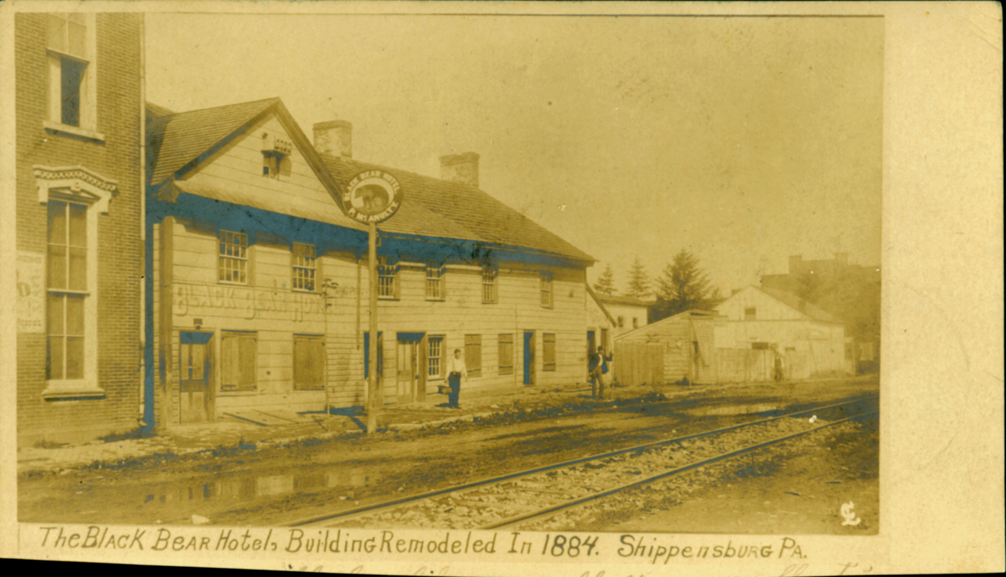 Postcard with caption "The Black Bear Hotel, Building Remodeled In 1884. Shippensburg PA" Railroad line in foreground. Verso has post stamp legible as "SHIPPENSBURG, PA MAY 14 9AM 1907" Verso addressed to: "Mr. Russell Nelson, M Connellsburg [McConnellsburg], Fulton Co., Penna."
